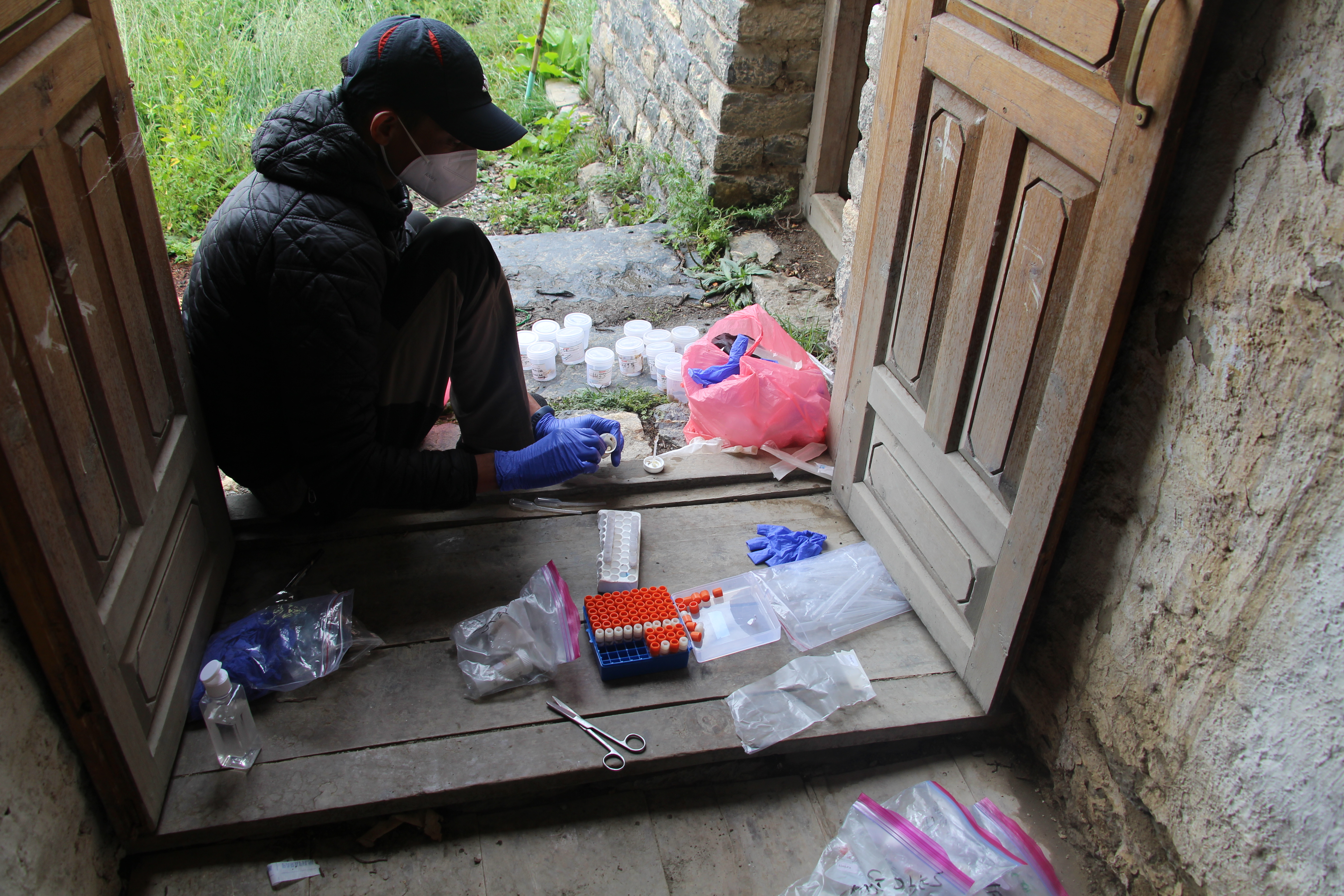 A rustic facade overlooks as our field member aliquots samples